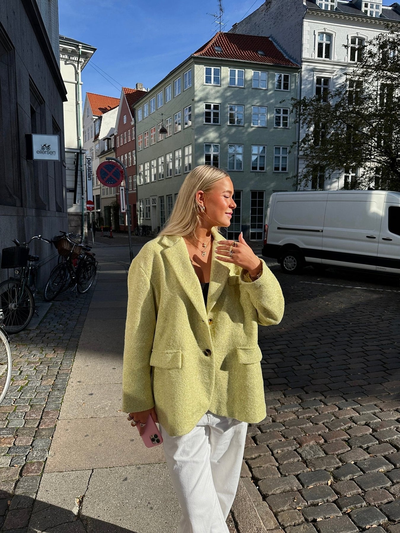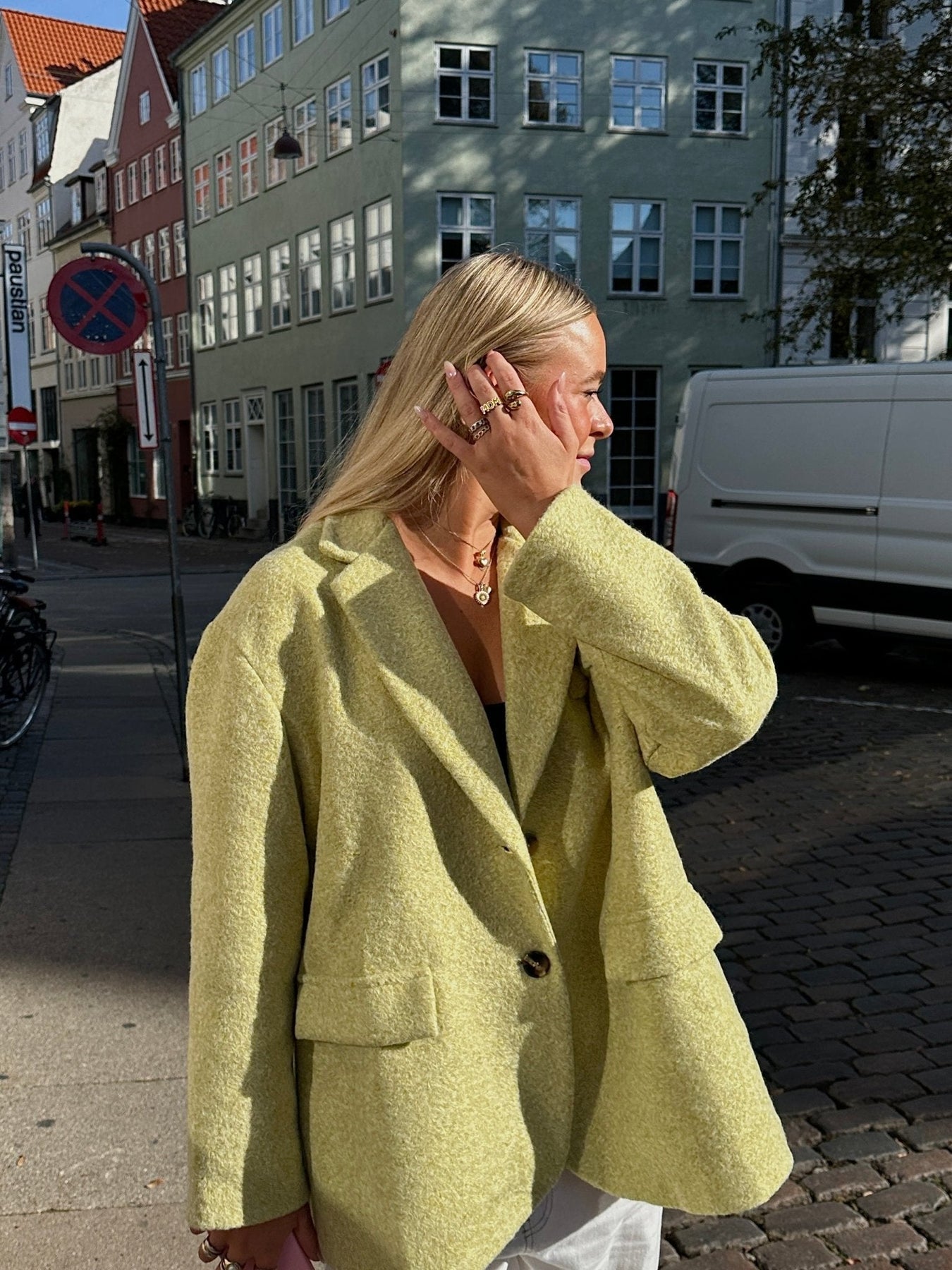 Blazer in a wool material, perfect for the chilly evenings of fall. The blazer has the coolest fit and is thick in the material. The perfect go-to blazer for a coffee break with your girlfriends.