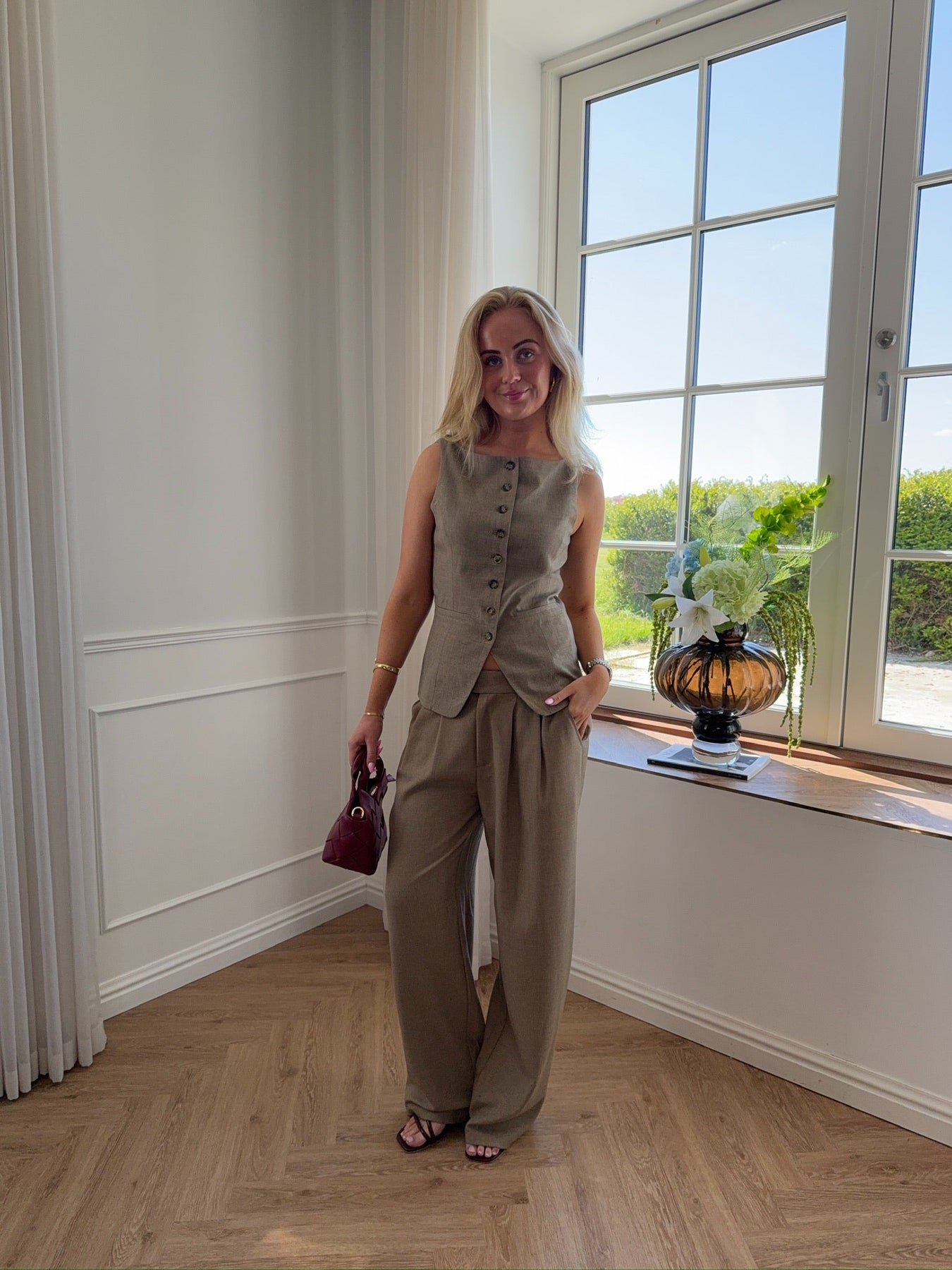 Nora Pants er den perfekte buks til både hverdag og fest. Bukserne har et loose fit og kan sidde både lavtaljet og højtaljet, alt efter hvilket look du ønsker. Bukserne har lommer i siden og en fin pyntelomme bagpå.