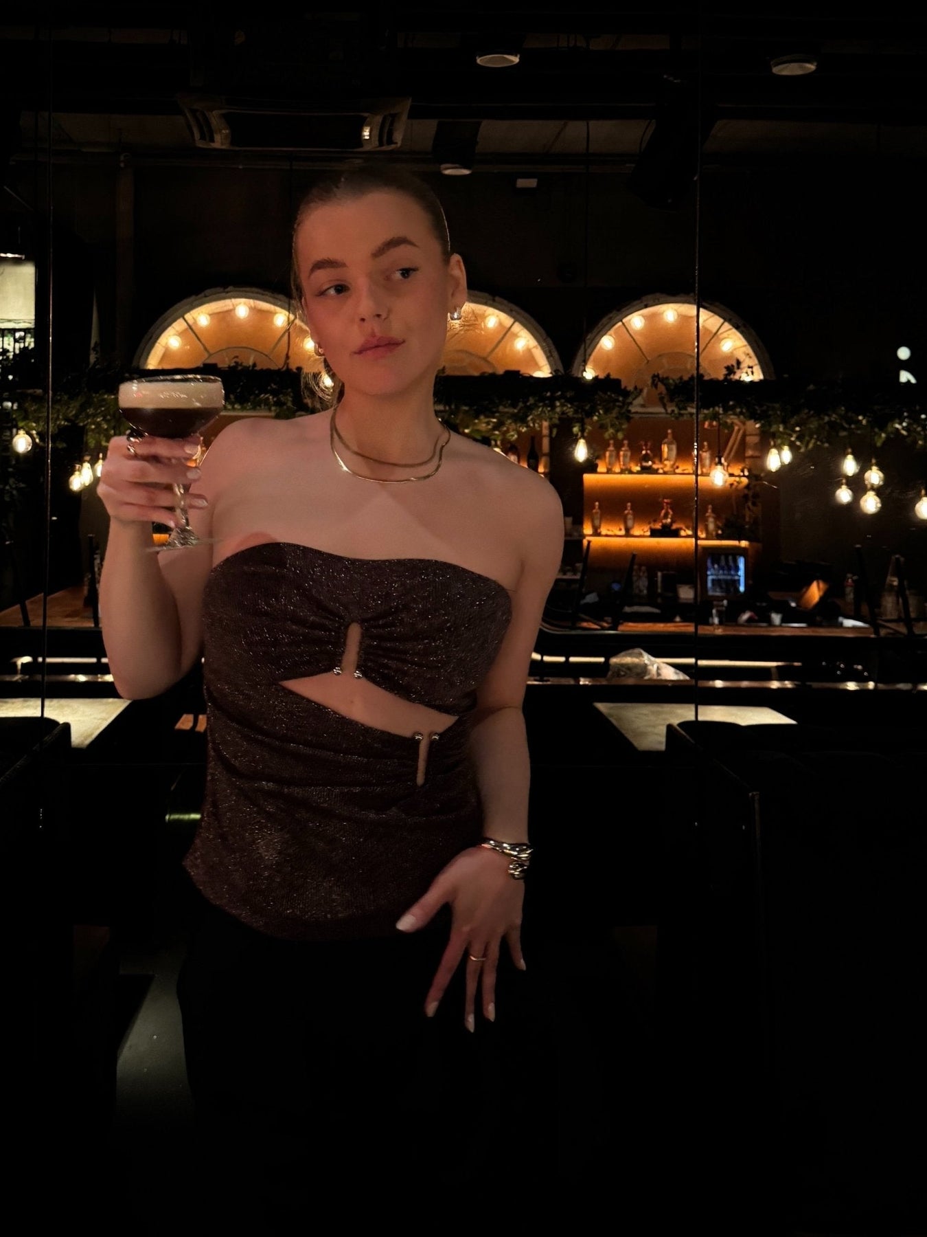 This brown bandeau top is the perfect balance between party and elegance. With its brilliant gold color and unique hole detail at the front for a subtle yet eye-catching look, this top is designed to attract attention on the most important party days - and especially New Year's Eve.