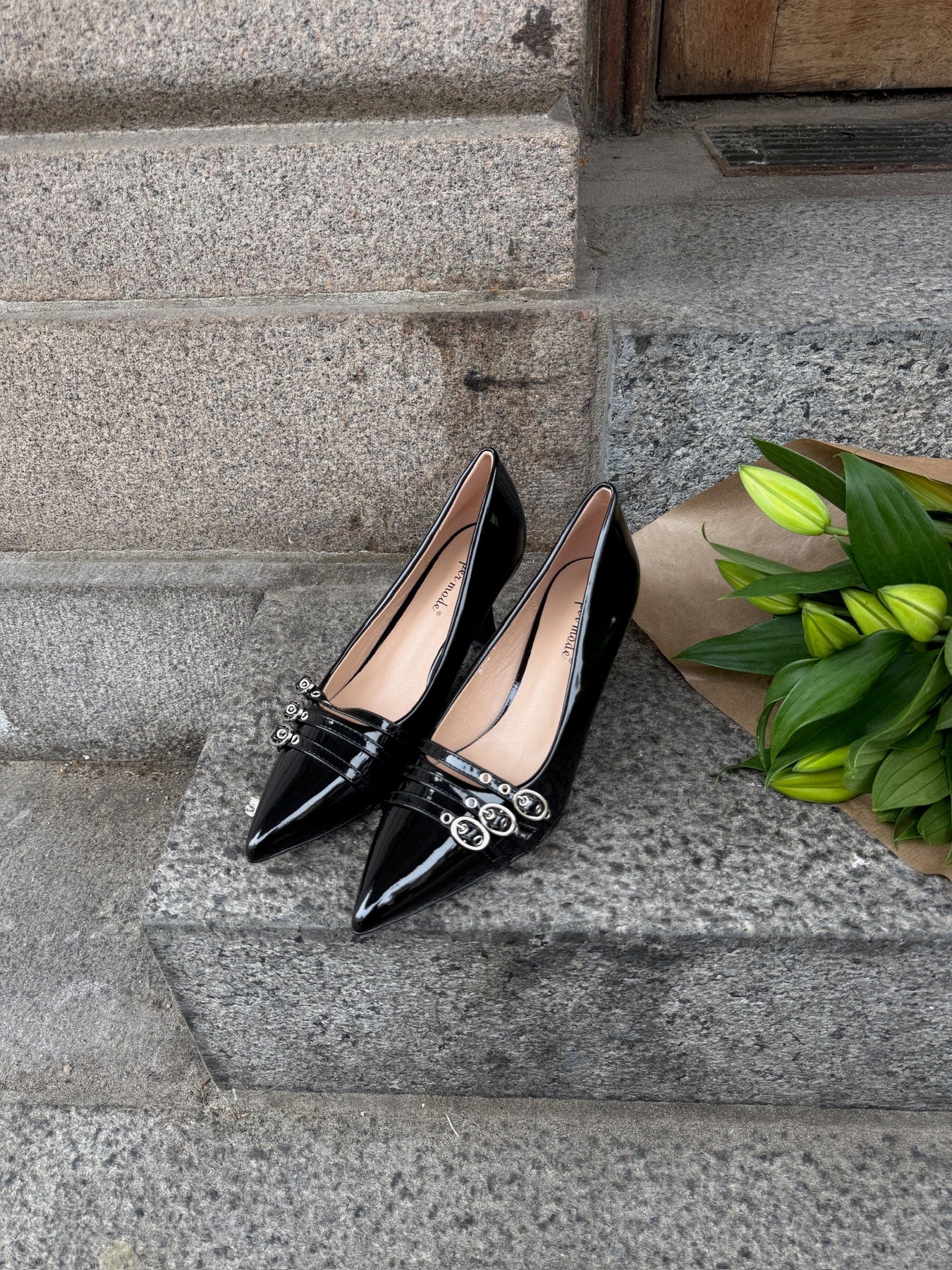 These black patent stilettos combine a classic design with edgy details in the form of three decorative straps with silver-tone buckles and studs.