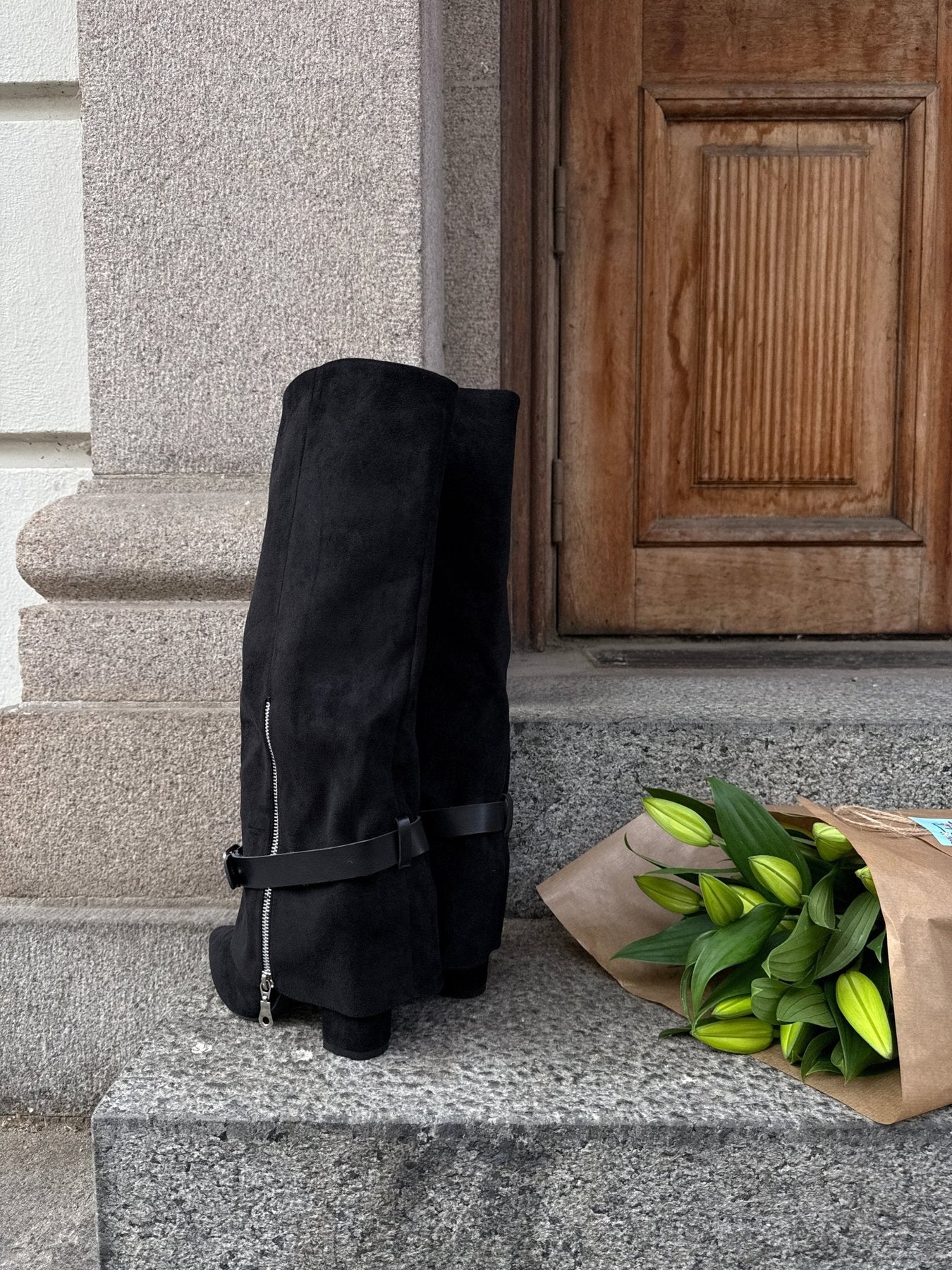 Our Dagmar boot in black is a knee-high boot made from faux suede with a loose fit and marked shaft. The design is characterized by a decorative zipper along the outside and a wide strap with a metal buckle around the ankle, giving the boot a modern and raw look.