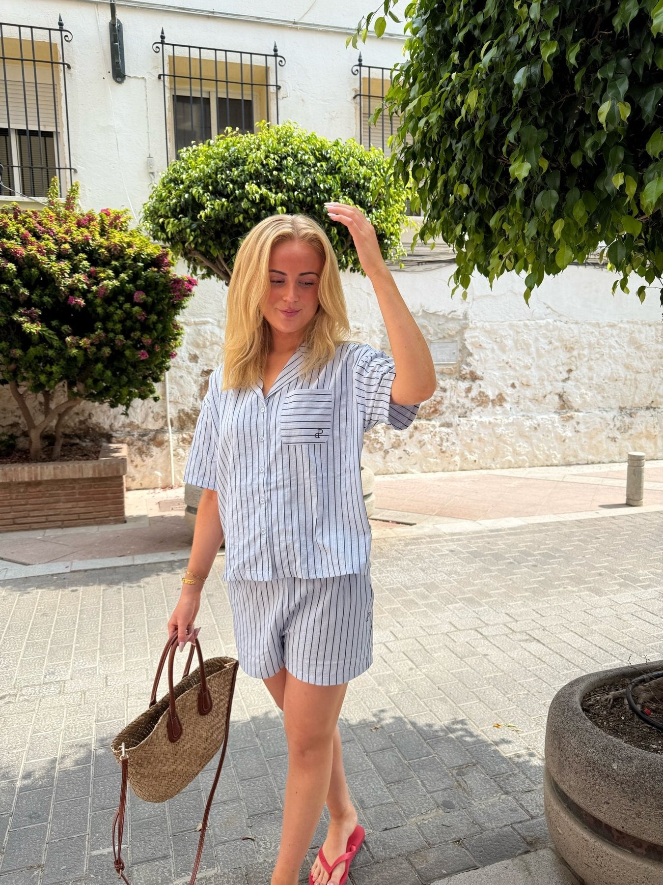 These shorts are the perfect mix of casual and stylish. They have a loose and comfortable fit, an elastic waist and practical side pockets - perfect for warm days when comfort is key. The striped design gives a classic summer look, while the small embroidered logo adds a simple yet exclusive touch.
