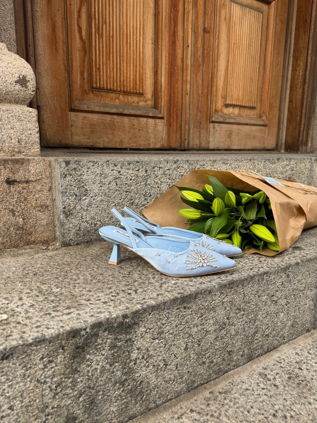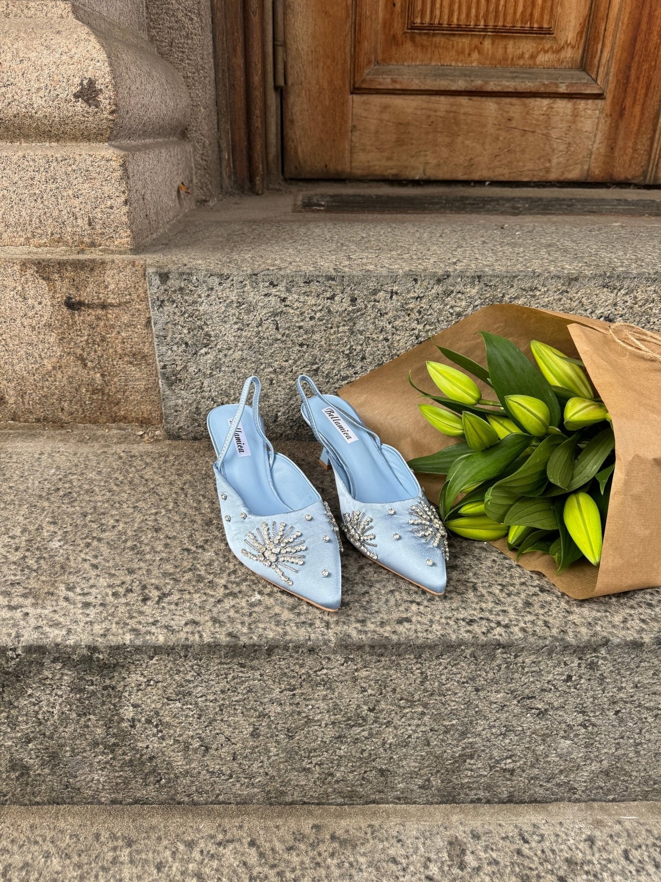 This blue slingback is for those who love to stand out with style and sparkle. The soft satin look combined with sparkling gems gives the shoe an exclusive and festive look.