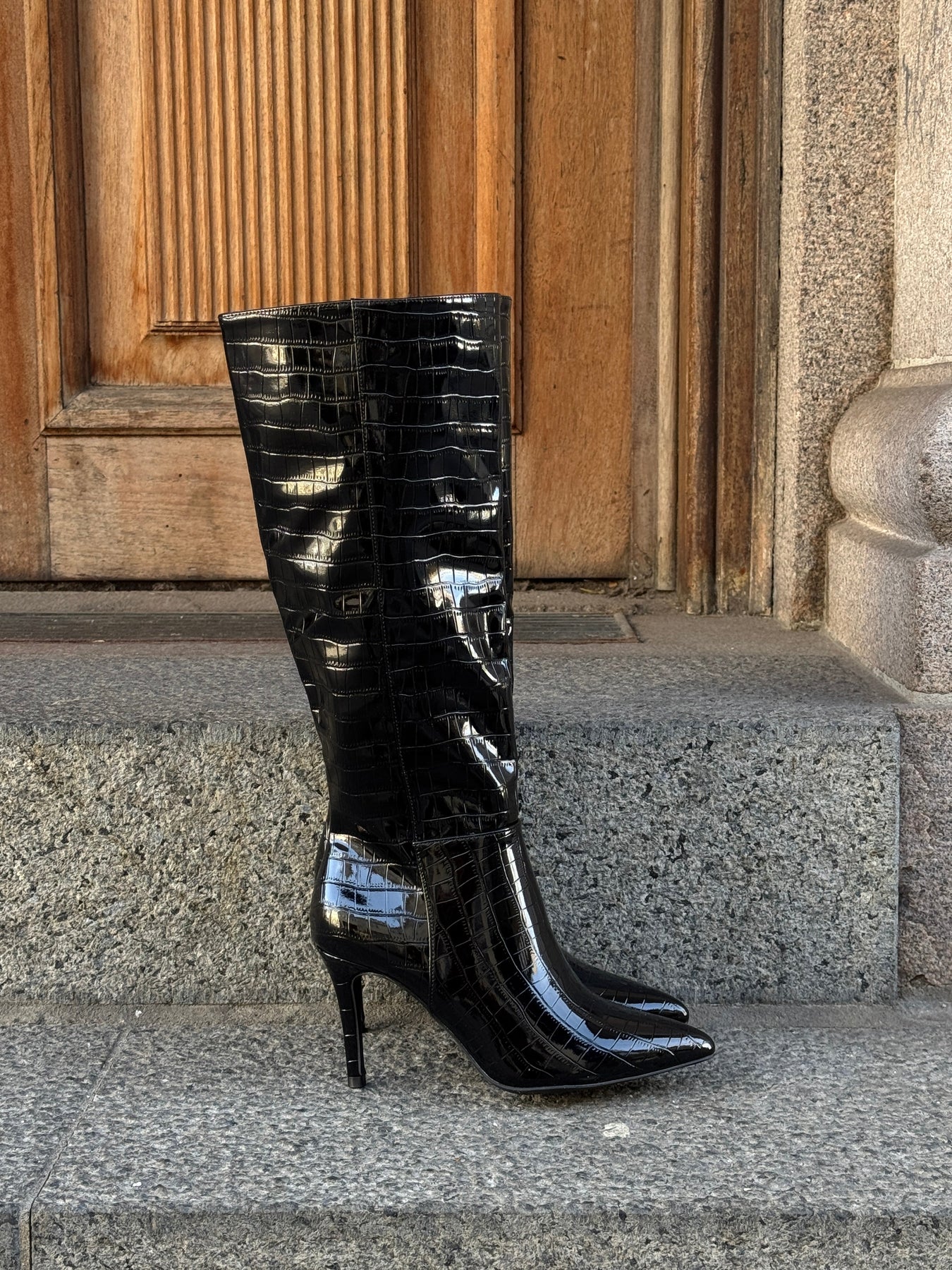Støvler med hæl. Materialet er i et glat, elegant krokodille look og har den flotteste mørkebrune farve.
