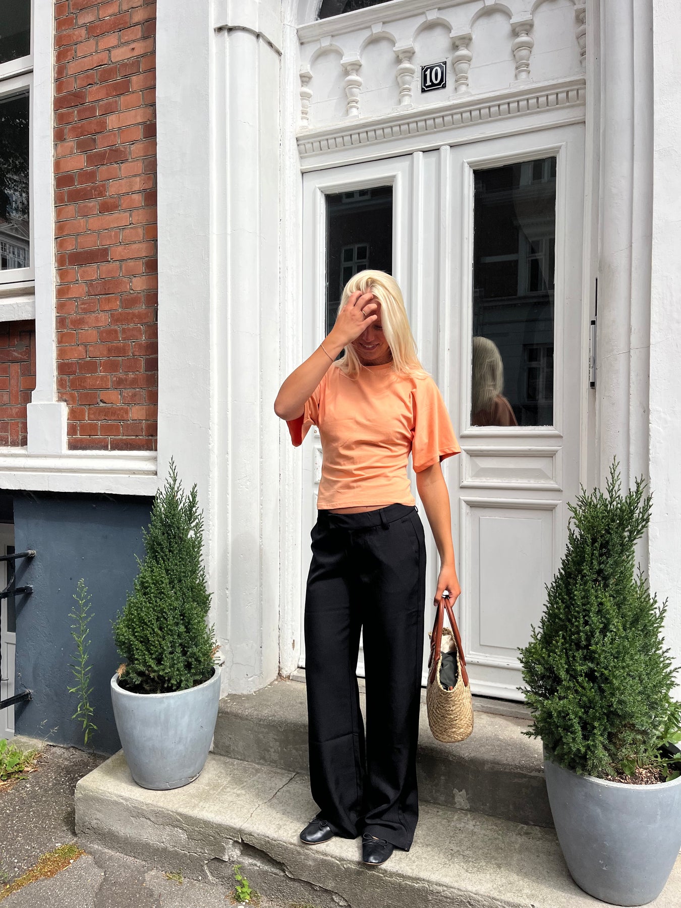 En top du bare altid kan bruge! Den har en superflatterende waisted pasform og korte ærmer, der gør den både enkel og feminin. Stoffet er blødt og strækbart, så den sidder pænt uden at stramme.