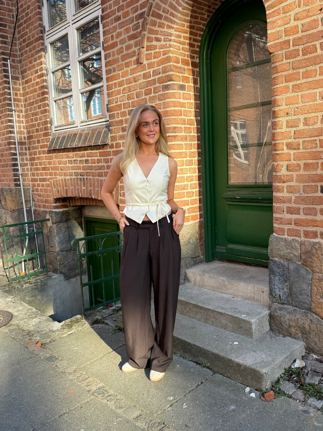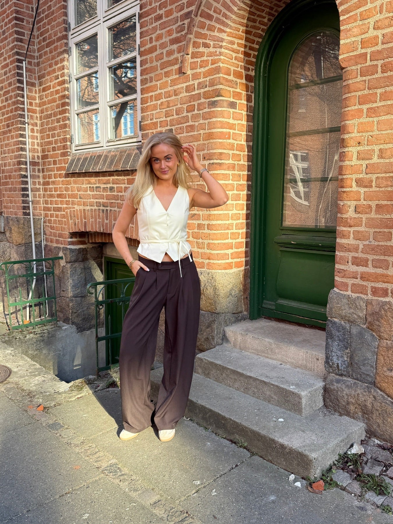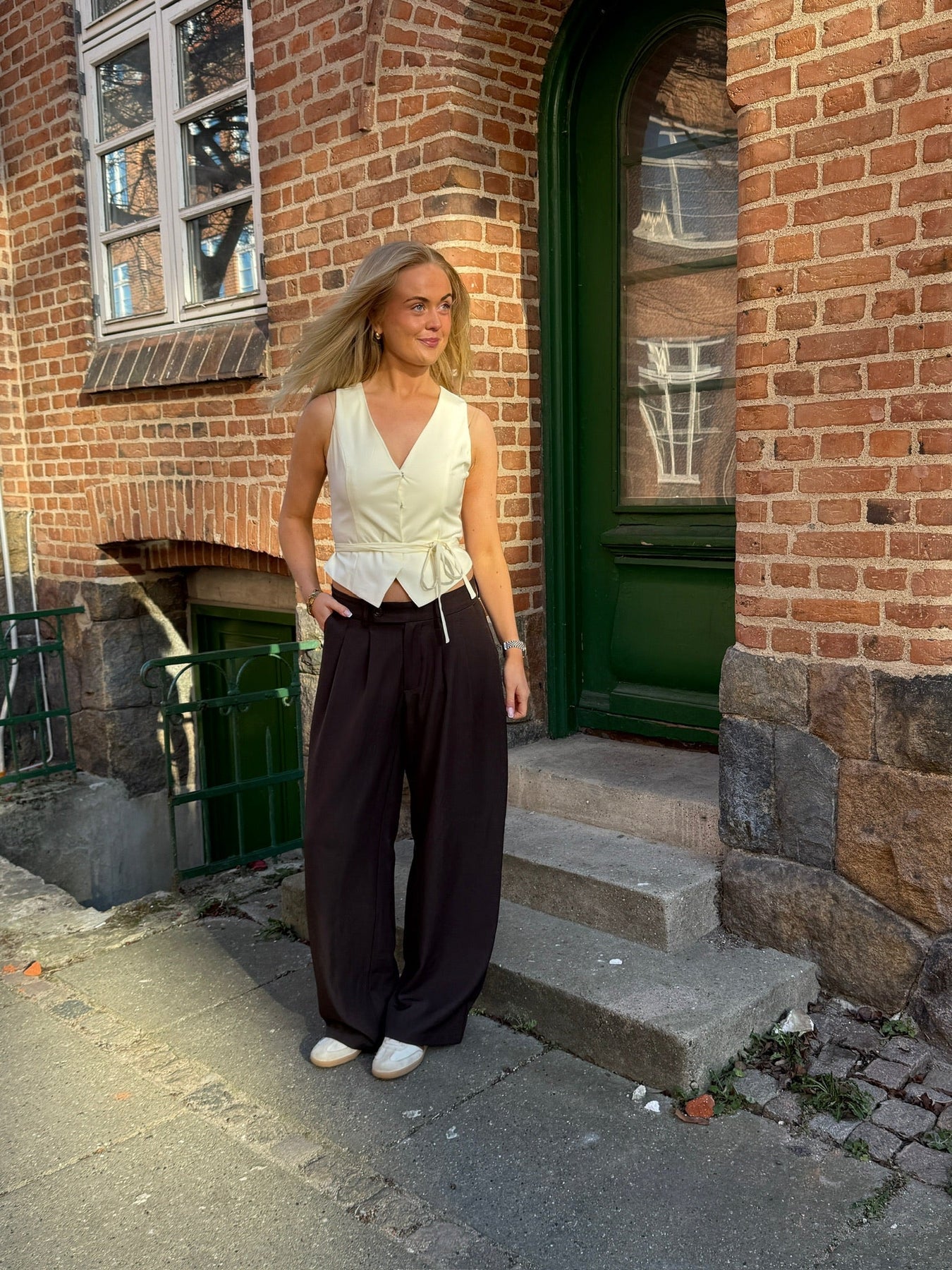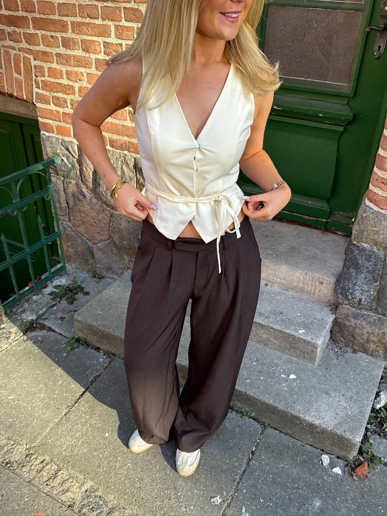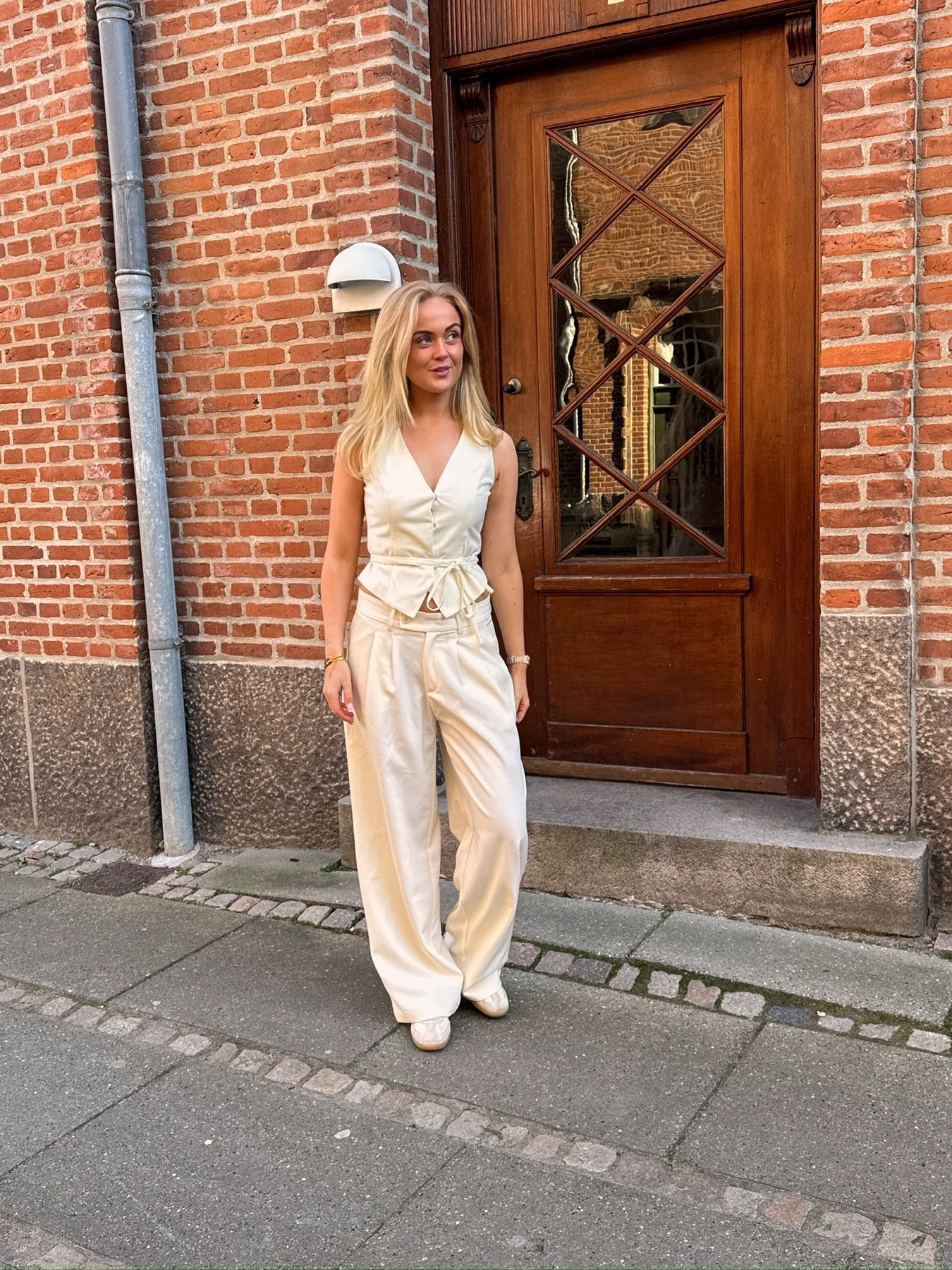 This suit-like vest is a must-have for the modern wardrobe. It has a stylish, classic design with inside front buttons for a clean and sophisticated look. It stands out with a ribbon that can be tied around the waist to beautifully accentuate the waist. The vest strikes the perfect balance between elegance and comfort, making it ideal for both everyday and more formal occasions. Use it to create a sharp and complete outfit - either as a statement piece or as part of a layered look.