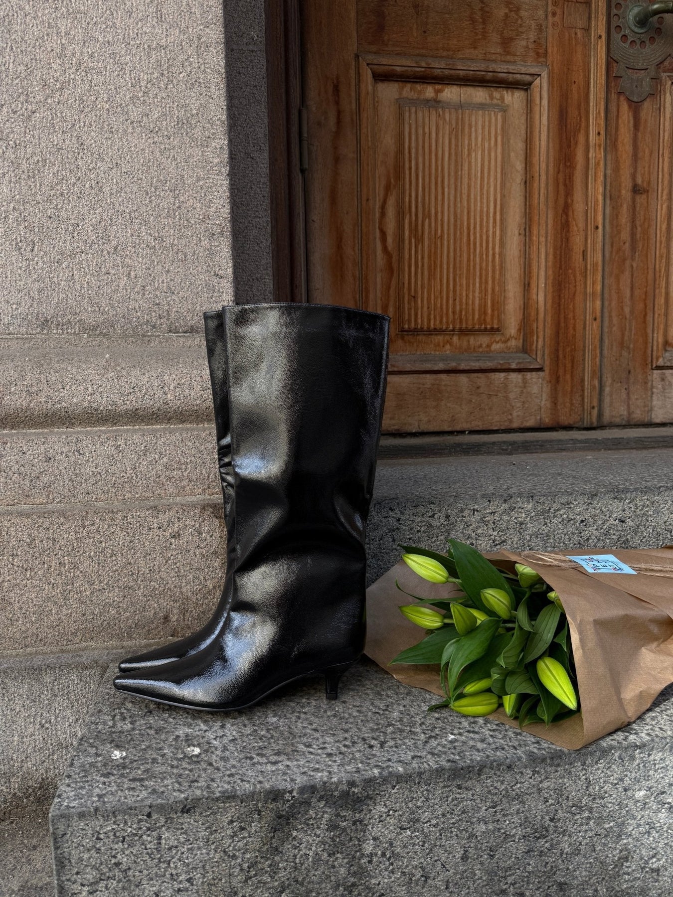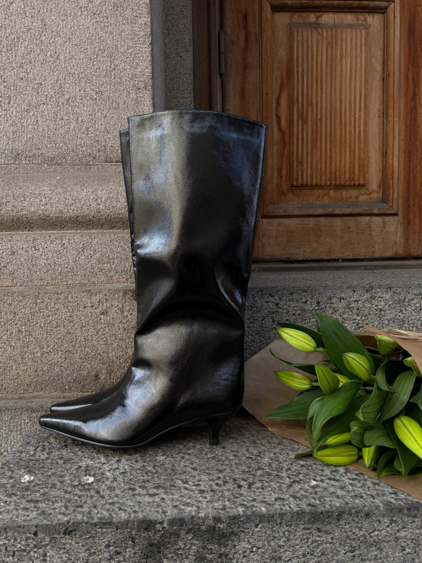 Our Madelaine Faux Leather Boots are elegant knee-high boots designed with a clean and modern look. The glossy finish gives a sophisticated look, while the pointed toe and low heel add a feminine touch.