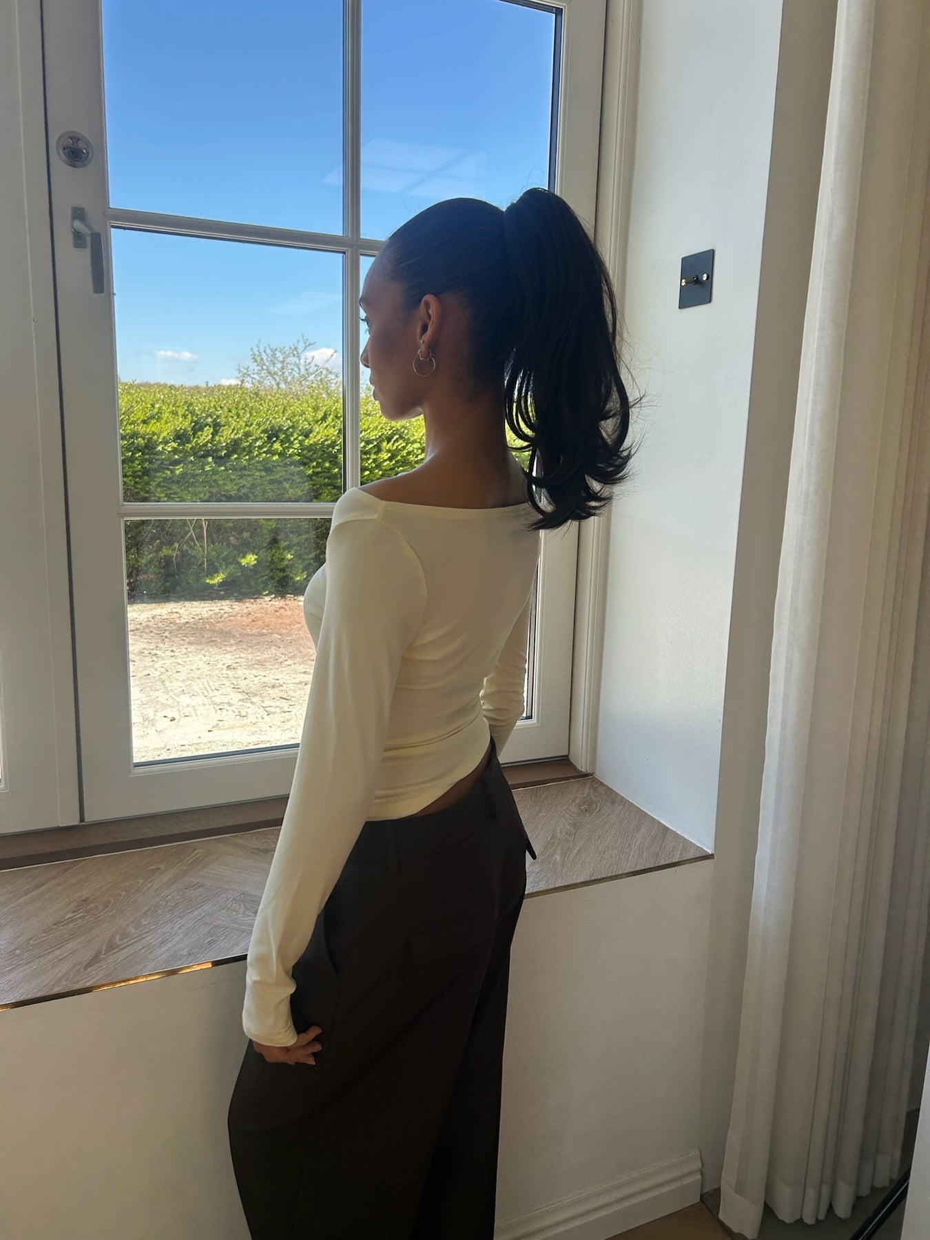 This long-sleeved top with a boatneck neckline is both simple and super stylish. It fits snugly without being tight and is made from a soft, stretchy material that makes it really comfortable to wear all day long.