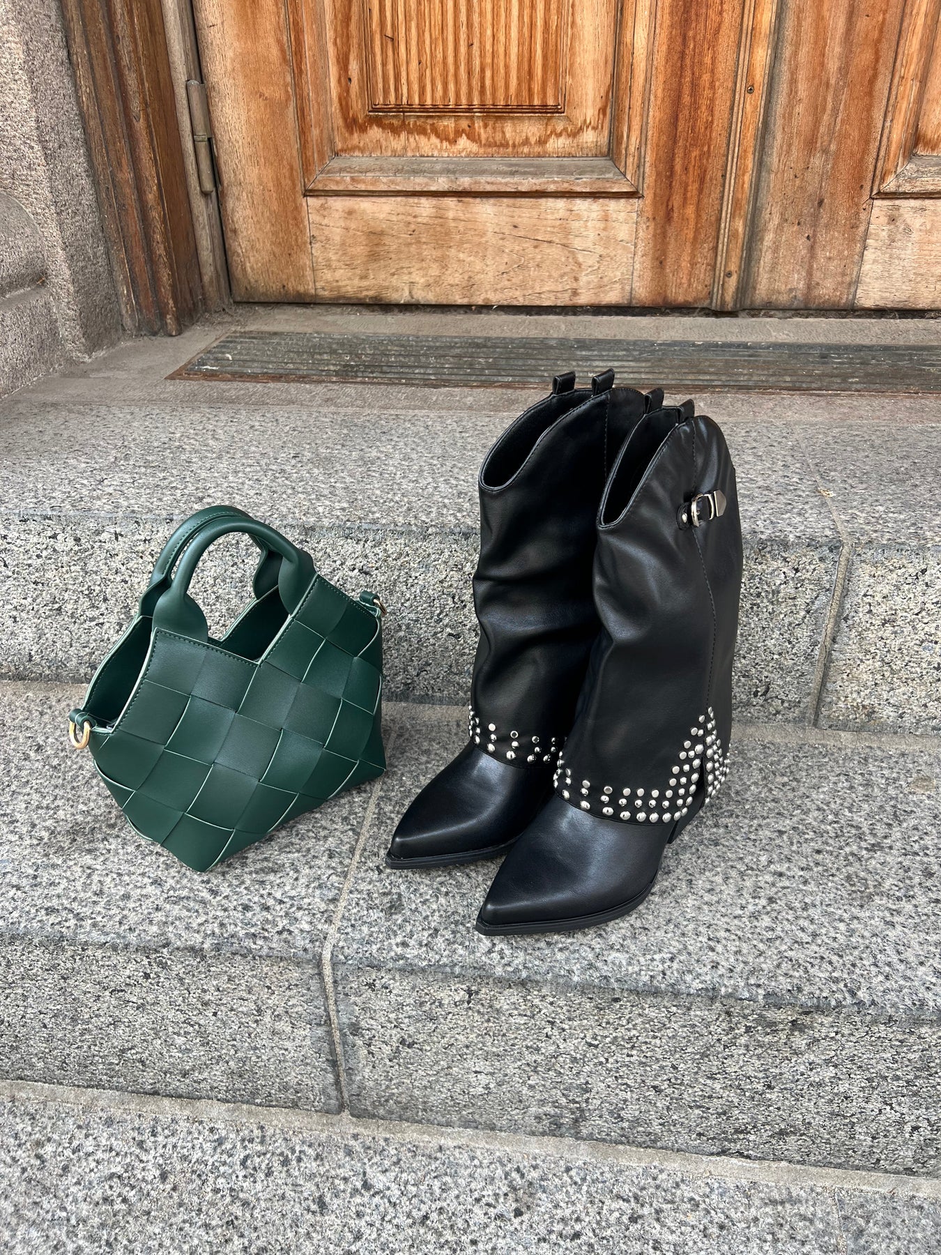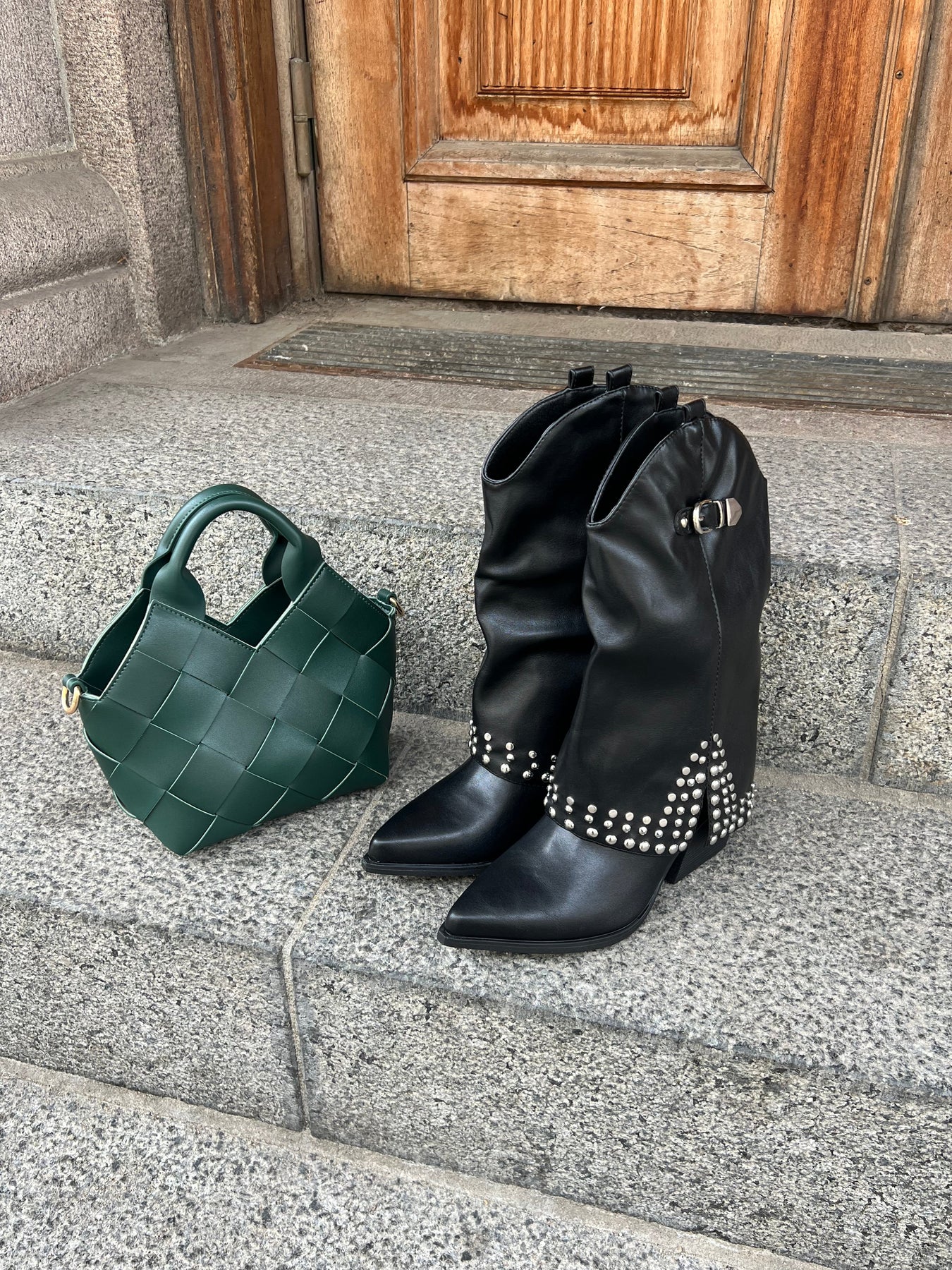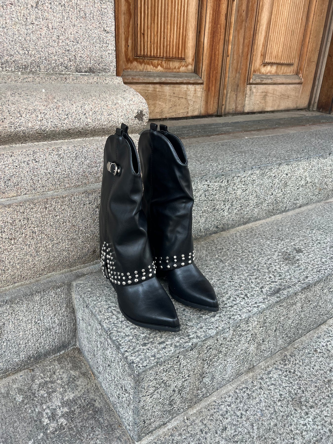 Riley Studded Boots are a pair of showstoppers with attitude. The black leather look, chunky block heel and bold silver studs give the boots a raw and edgy look. The pointed toe and buckle detail complete the western-inspired design - making them perfect for everything from party nights to cool everyday looks.