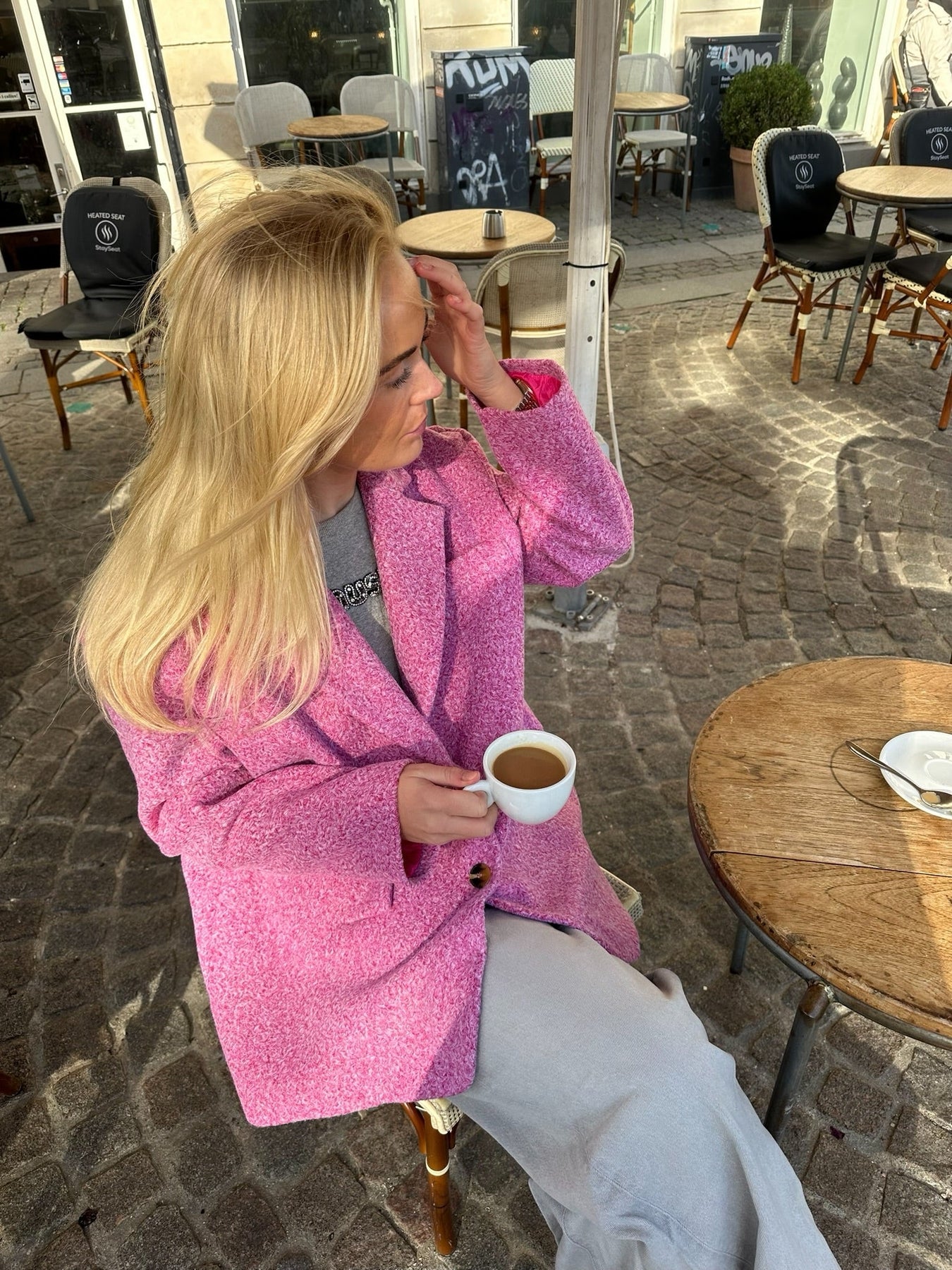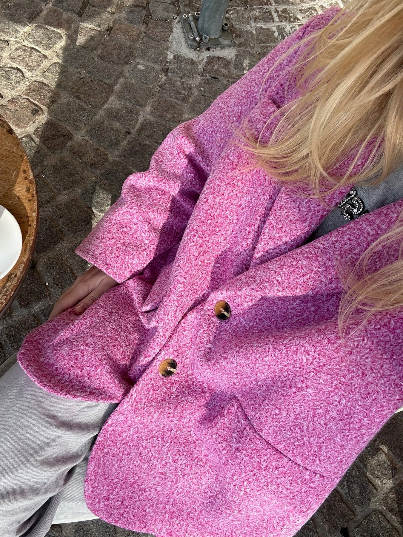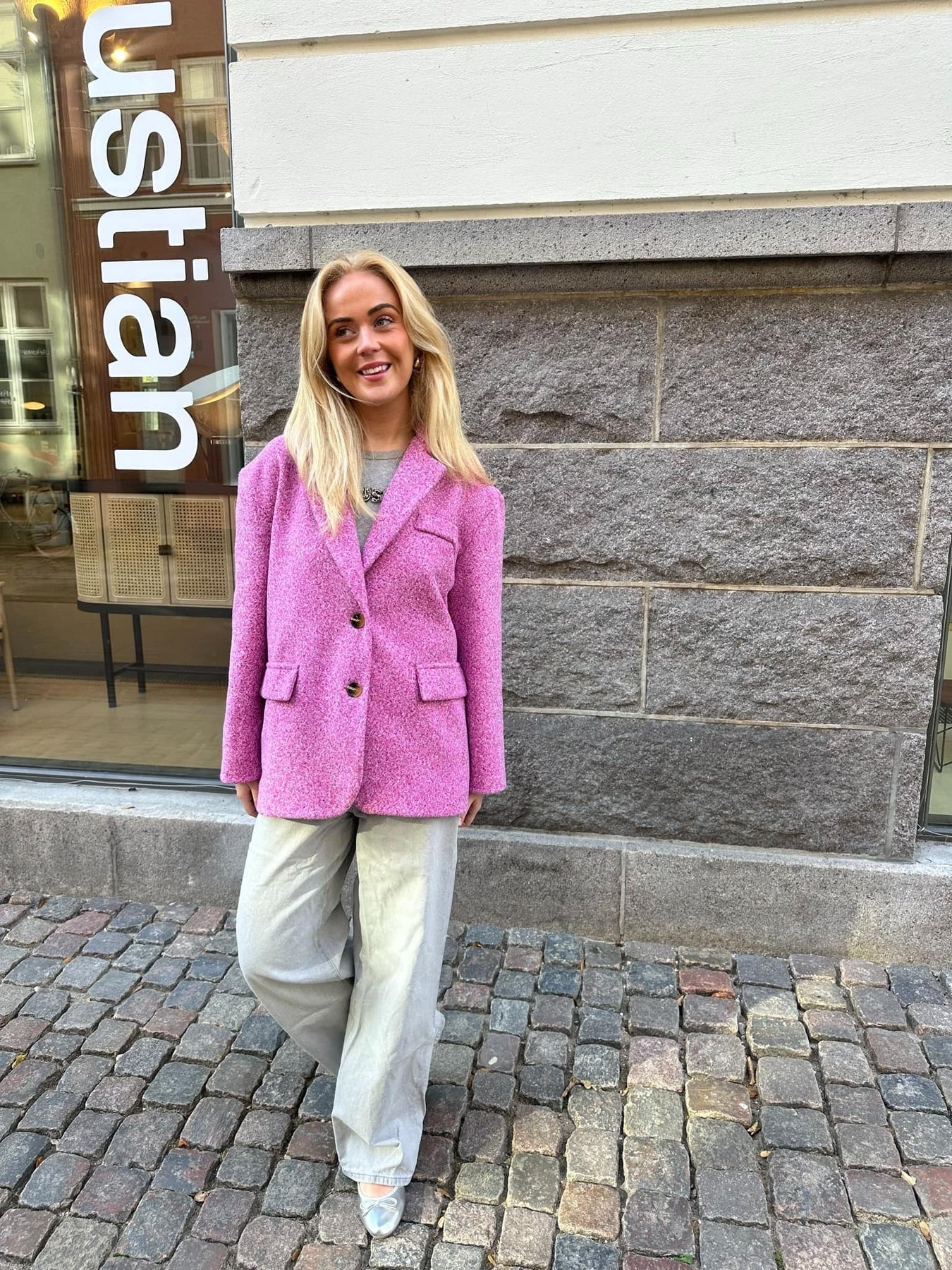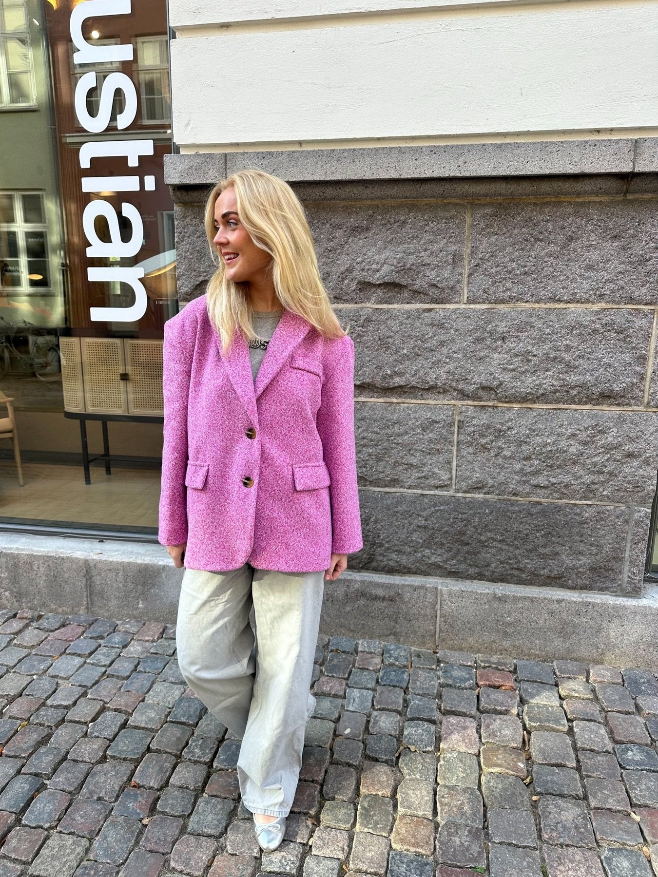 Blazer in a wool material, perfect for the chilly evenings of fall. The blazer has the coolest fit and is thick in the material. The perfect go-to blazer for a coffee break with your girlfriends.