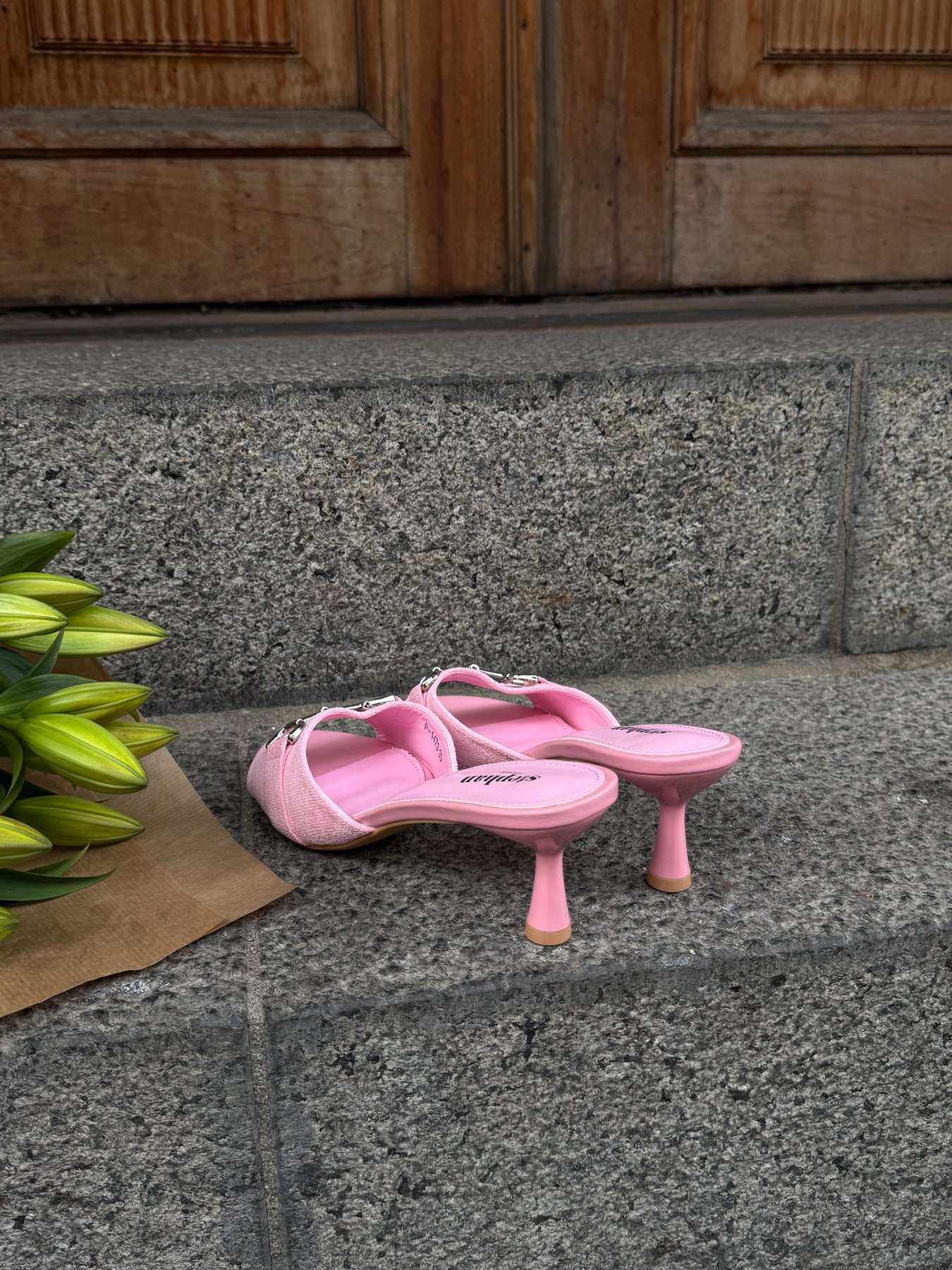 This stylish mule in pink brings a feminine and sophisticated look to any outfit. The small buckle on the upper adds a subtle yet luxurious detail.