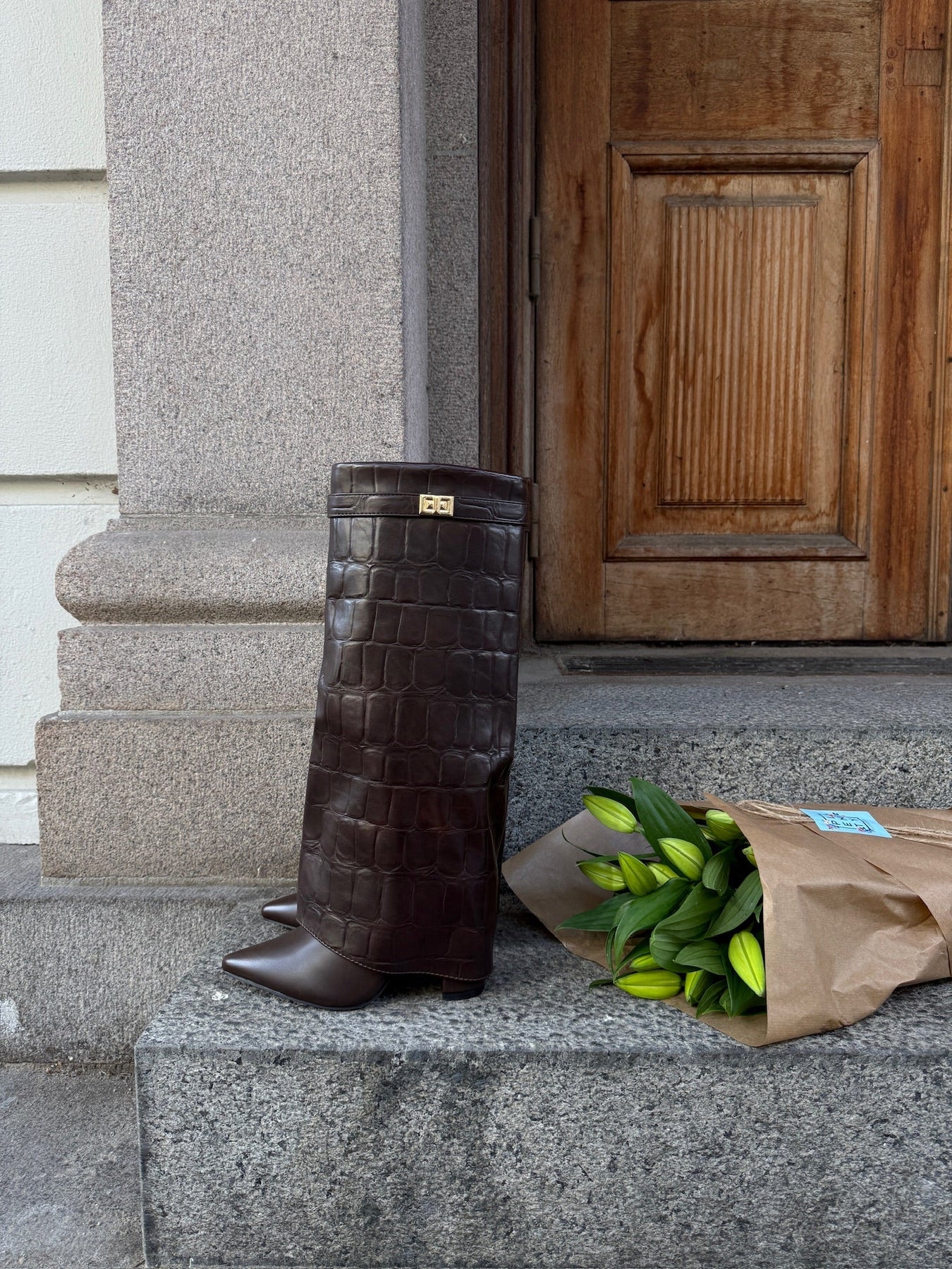 Tilda Boots is a knee-high boot in dark brown faux leather with an embossed crocodile texture. The model has a pointed toe, block heel and a visible zipper on the inside for easy on and off. A discreet gold detail at the top of the shaft completes the elegant look.